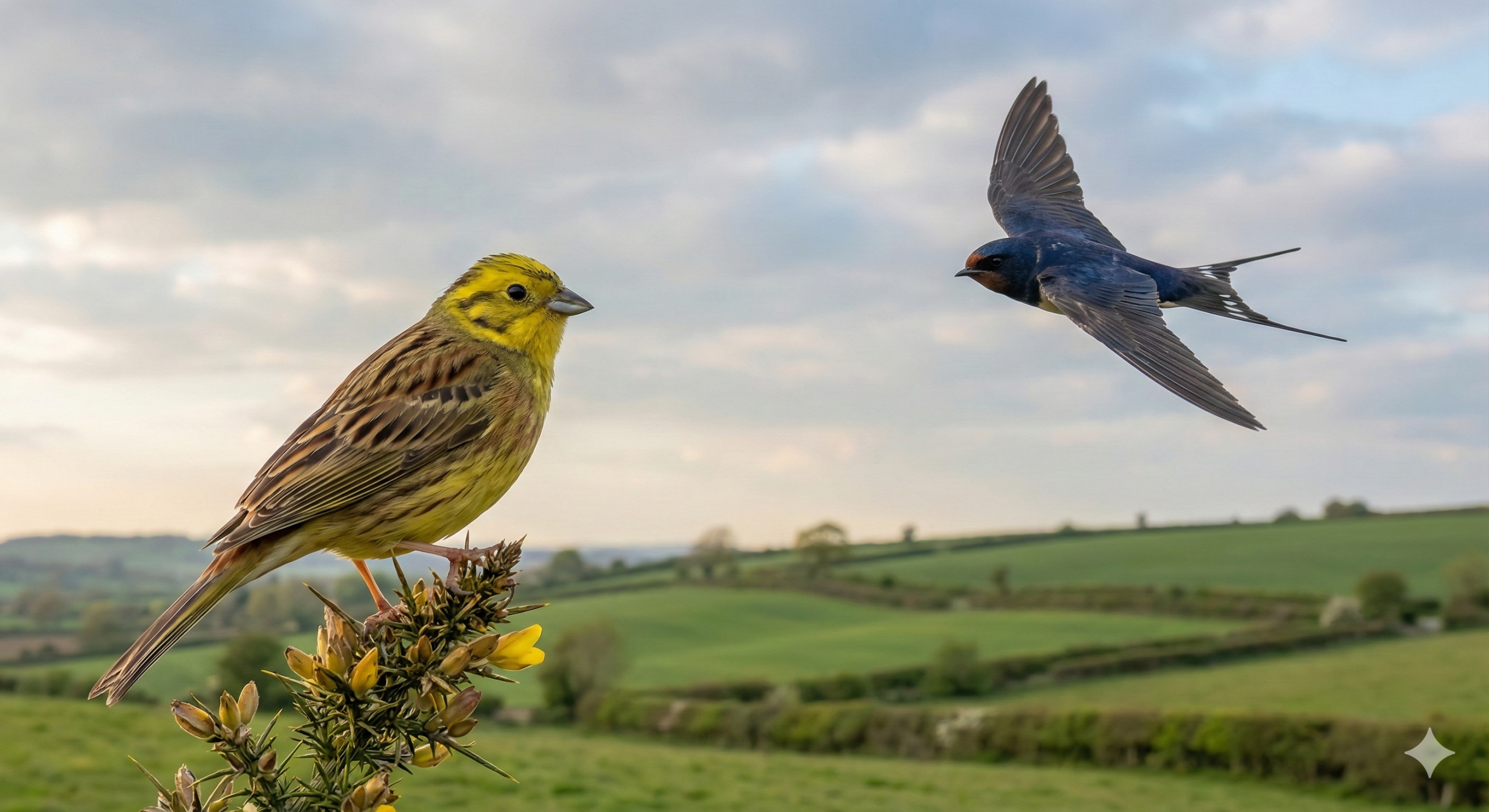 Swallow perched on telegraph pole along Skew Hill, singing quite merrily. Yellowhammer singing away along Stanley Hill. I disturbed some largish bird,